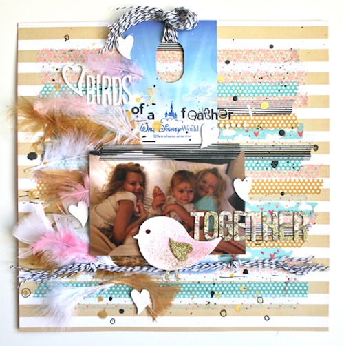 The feather and bird trend is just so fun, isn’t it? I have played around with it a bit here and there, but decided this was my week to really go for it! After layering up some of my favorite Washi Tapes, I simply adhered some feathers to my page to act as a little cushion for my photo flap. A little strip of washi creates a photo flap that also lifts up to show my ephemera and journaling. With that all set, I grabbed my Baby Bird Sizzix Die and some Grunge Board. A title and some Doodle Twine complete this page all about my little birdies.