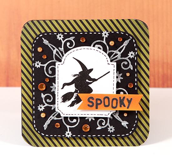 To top off the Halloween look, I stamped the witch from Hero Arts’ You Scare Me stamp set, adhered some striped paper from American Crafts Pumpkin Patch 6×6 pad, and blinged it up with Hero Arts gems and pearls.