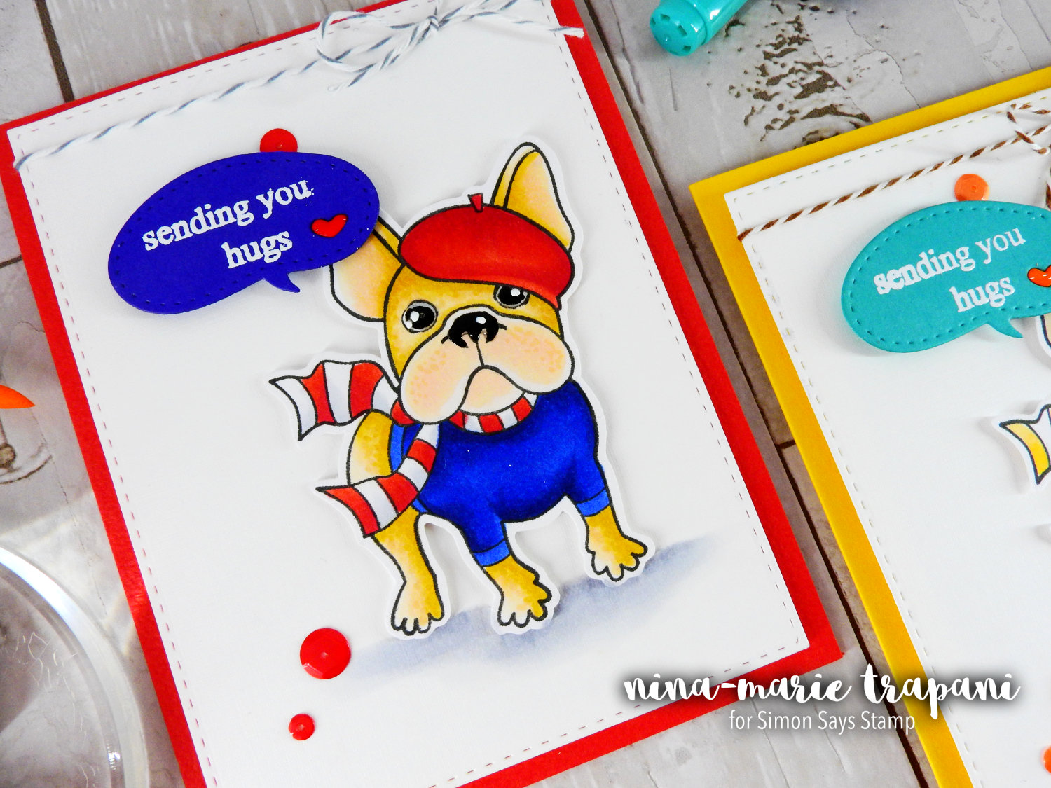 The cute pup in the Frenchie Frenchie stamp set TOTALLY reminded me of two of my friends’ pets. Because of that, I colored the dog to look like their pets! The golden brown dog reminds me of my friend Stephanie’s new pup named Lucas. The brown and white dog looks just like my friend Heidi’s dog named Simon (which happens to be who Simon Says Stamp is named after)! I think it is so much fun to color pet themed products to look like pets we (or our friends) have in our lives!