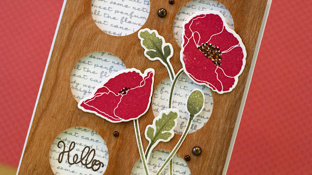 Jennifer has created a beautiful card that features the Simon Says Stamp Tri Circle die and Cherry Wood Paper along with the Pretty Poppies stamp set from My Favorite Things.