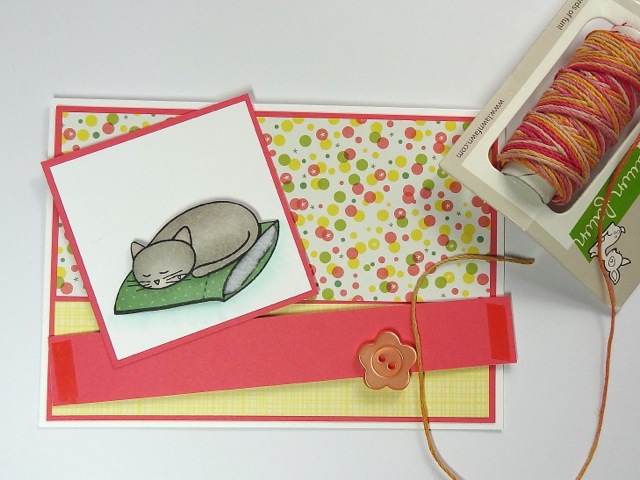 I chose the polka dot paper from the paper pad to paper piece the cushion, and I also used some white felt for the filling. I stamped the cat image onto the upper part of the cushion so that I didn’t have to fussy cut around the whiskers.