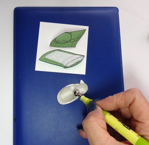 Here I am using a McGill Tool Kit to round the cat image and the upper pillow. Quick tip – scratch your head with the ball of the tool, or use a bar of soap, to slightly lubricate the ball so that it rolls smoothly over the back of the paper. I am using a craft moulding mat too.