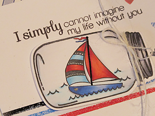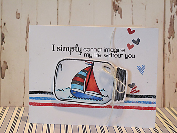 Happy Summer, Simon Says Stamp friends! I love the look of decorating by adding cute decor pieces inside a vase or a jar so I am, of course, delighted that there are several adorable jar stamps available to create my own “embellished jars” for cards and other paper crafted projects! While searching through my stamp collection I knew I wanted to create a summer-themed card with the boat from the Avery Elle Knotty Stamp Set and what better way to showcase this cute sailboat then to add it inside this Hero Arts stamped jar! I tilted the jar on it’s side for this card, stamped the waves and masked off the longest wave before stamping the boat then I colored in the whole jar with Copics before die cutting and adding it to my card. With so much going on inside the jar I kept the stamping and embellishing on the card base to a minimum to make the jar really shine. I have to mention that I adore the newest Simon Says Stamp Inside & Out Sayings stamp set. It makes it so easy to not only add a fun greeting to the outside of your card but to make the inside of your cards shine as well!