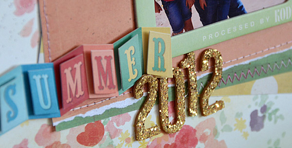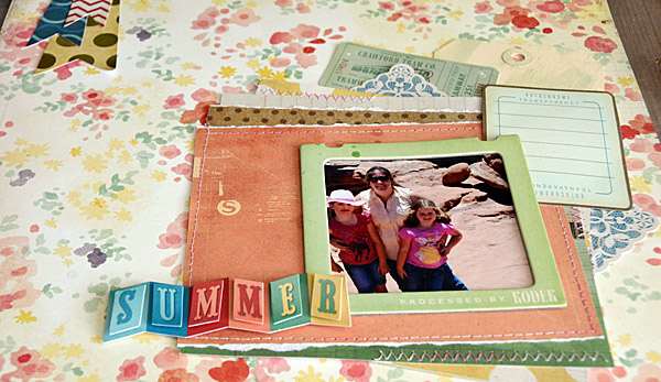 Layering with 6×6 paper is so fun – I like to just position it so little bits and pieces peek out here and there. I also love to build a nice mat (as I have above) and stitch on it before adhering to my layout. This lets me play around with position and see what I really like.