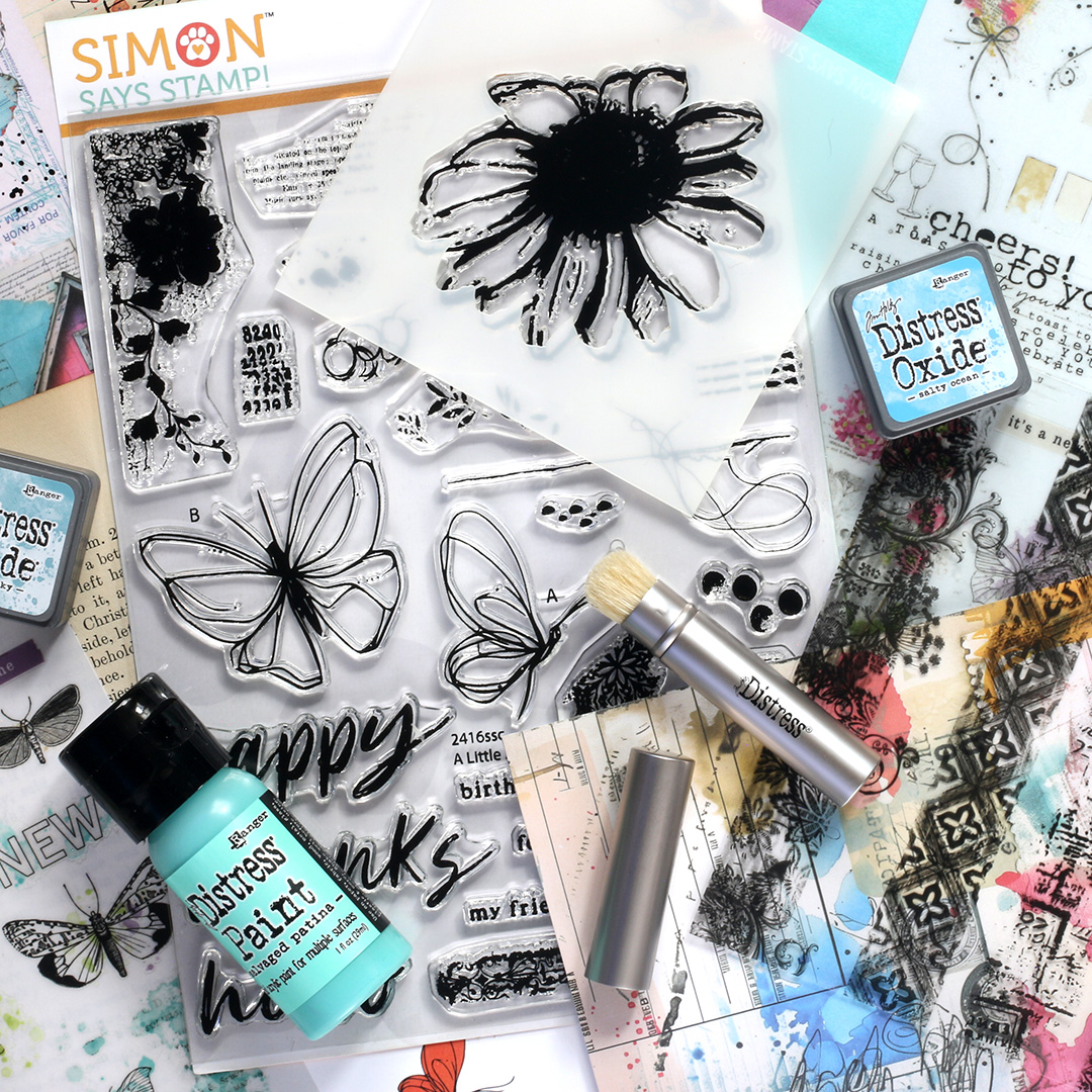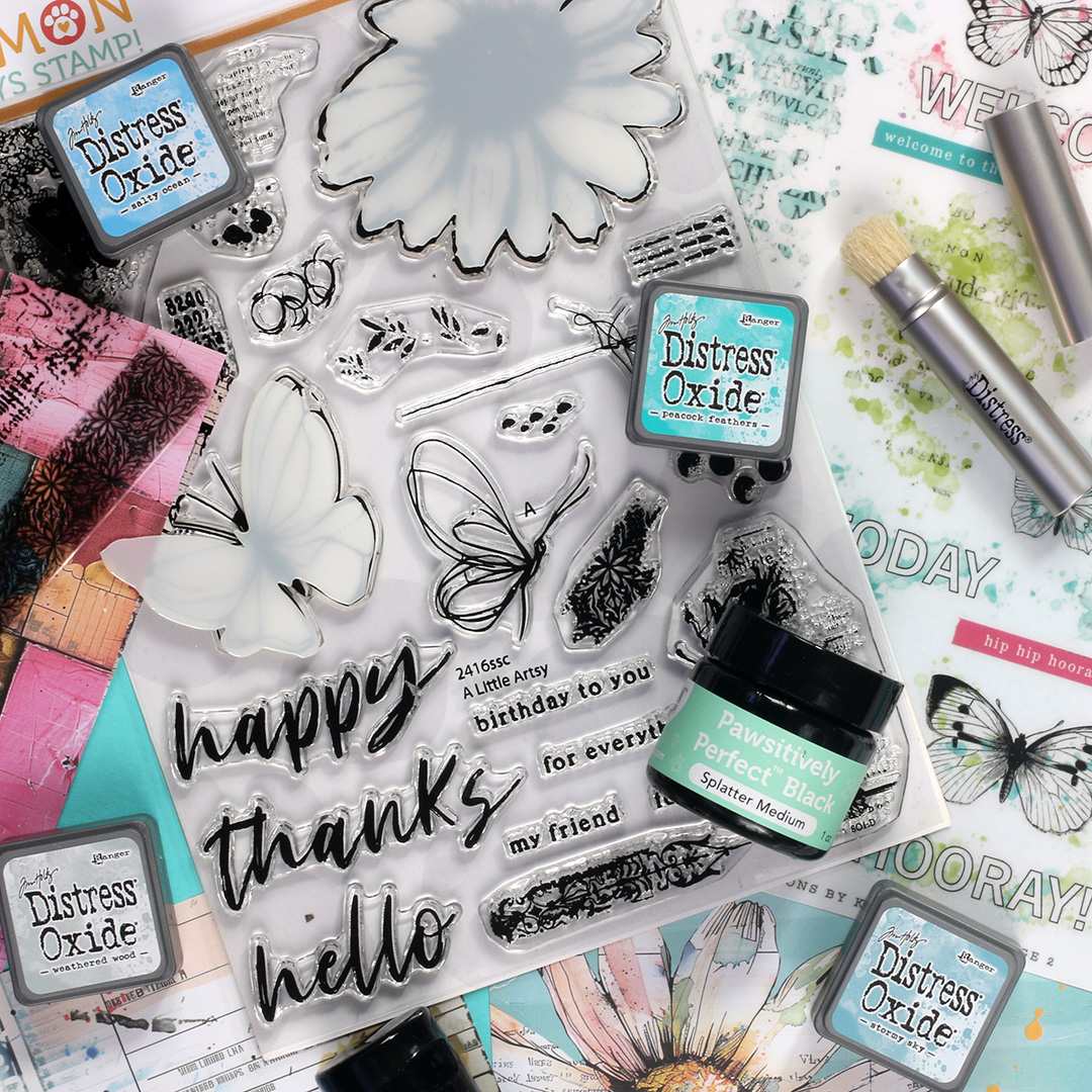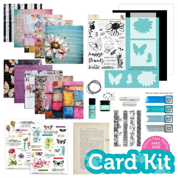 Dive into this eclectic kit curated with you in mind! It includes three awesome NEW exclusive products from Simon Says Stamp: A Little Artsy 6×8 stamp set and A Little Artsy coordinating 4×4 stencil set, and one sheet of A2 Creative Overlays transparencies.