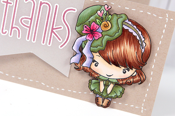 For the sentiment, I embossed “thanks” from Paper Smooches Chit Chat stamp set on vellum, turned it over and colored the interior of the letters with a Copic marker.