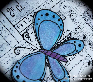 On the butterfly, Laurel heat embossed it and used a waterbrush and Distress Inks to color it in. For some extra super-shine, she used Perfect Pearls pigment powder on top!
