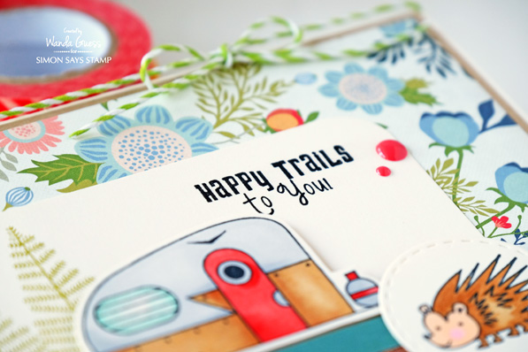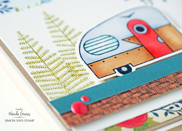 I love patterned paper! I have tons of it at my house. I love to use lots of different patterns from the same pad. Here I’ve cut a couple of little accent strips to add a pop of texture and color. I used my Copic Markers to color the camper to match the paper.