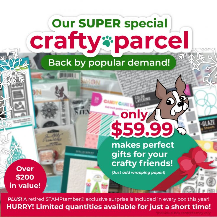 Also! Back by popular demand for a very LIMITED time is our super special Crafty Parcel! Valued at over $200, this jam packed box of exciting goodies from a variety of great brands is a MEGA value at only $59.99! New for this year! We’ve added a retired STAMPtember® exclusive surprise IN EVERY BOX to surprise and delight you!
