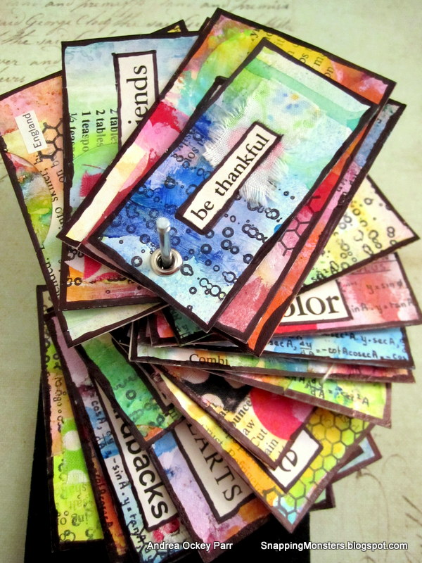 Andrea made a spinning stack of gratitude cards that are decorated with some of her favorite stamps from IndigoBlu: Rain Droplets, Calculus, and Rugged Edge.