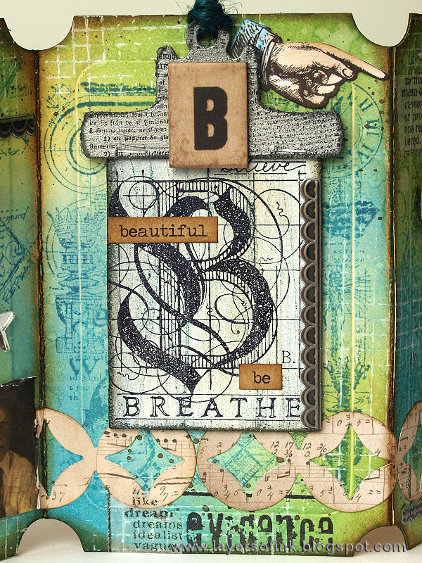 My first thought when starting with this tutorial was to use Stampers Anonymous Classics stamps, which are great examples of artsy stamps. The Classics sets are re-releases of older wood-mounted stamps and all the twenty sets available are gorgeous. I made an accordion booklet using Tim Holtz new Sizzix Big Ticket as my base.