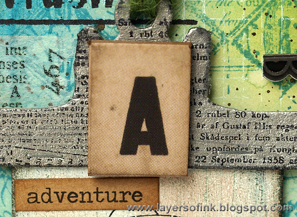 Embellishments: Tim Holtz Idea-ology: Chit Chat Stickers, Symphony Tissue Tape, Mirrored Stars, Thrift Shop Ephemera Pack, Borders Industrious Stickers, Frames and Trims Industrious Stickers, Jute String, Alpha Chips, Elastic Loops