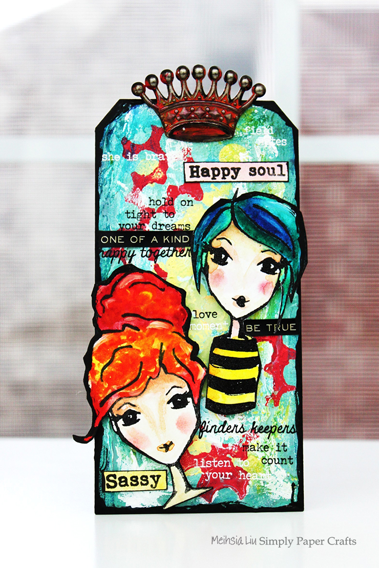 Meihsia was inspired to created a mixed media tag using the lovely Inky Antics Sassy & Saucy Clear Stamp Set and colored it with Tim Holtz Distress Paint.