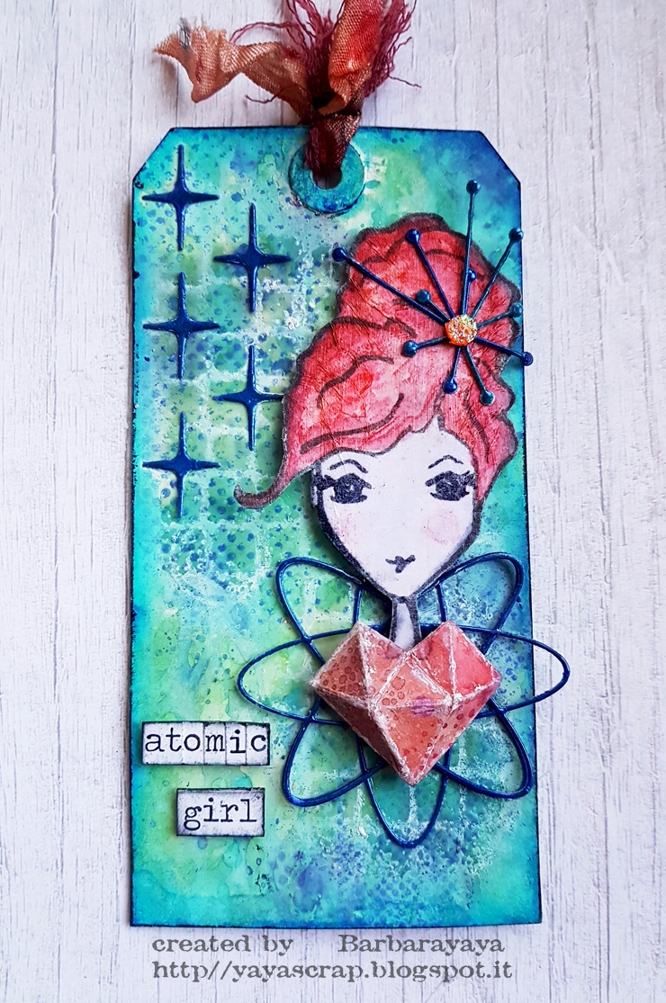 Barbara has created a tag with Inky Antics set Sassy& Saucy designed by our super talented teamie Andrea. She was inspired by Rita Hayworth, atomic girl of the 50s! She used Distress oxides , Tim Holtz Sizzix Atomic Elements and Faceted Heart, Tim Holtz Stampers Anonymous Halftone, Tim Holtz mini stencil set 9.