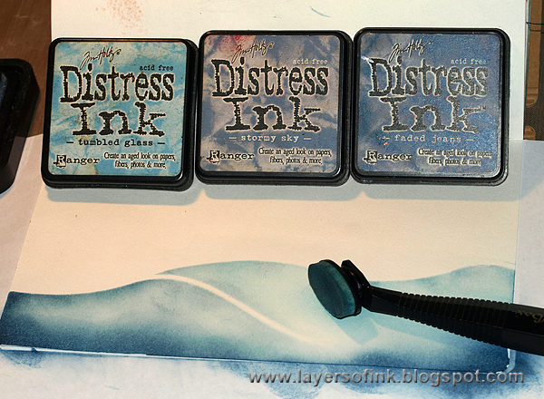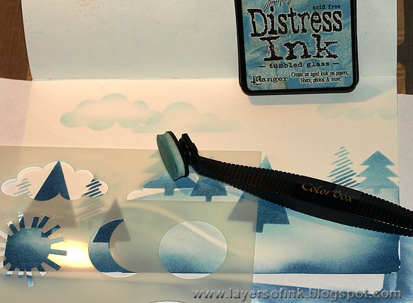 Ink the snowy hills, carefully holding the stencil in place. I used a Colorbox Stylus Tool for my inking, with an oval blender foam tip. It gives great control. Start with the lightest shade of blue (Tumbled Glass) and continue with Stormy Sky and then Faded Jeans. Move the stencil to complete the hills.