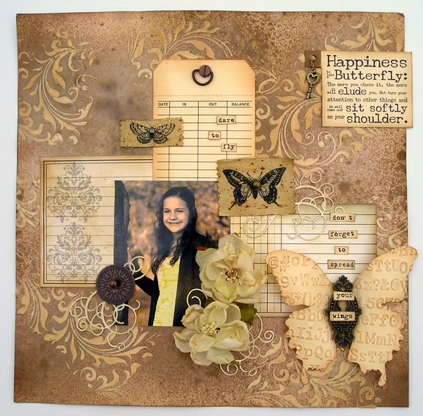 Have you ever had something that inspired your entire project? Usually when this happens I end up not using it on the project. This time the tag had me thinking of a monochromatic layout even including printing my photo in sepia tones. I used some beautiful Ranger Distress Stain Sprays (Vintage Photo and Antique Linen) along with the Tim Holtz Flourish Laying Stencil to create a backdrop for the photo and journal cards. I was happy my inspiration piece made it all the way through to the finished project.