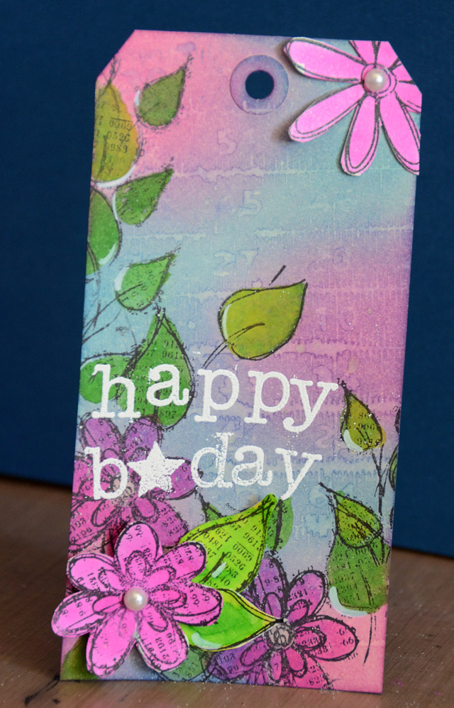 Like Cheiron, I heard green challenge and grabbed for my beloved Dylusions leaf stamps! I had a lot of creative fun making this tag and layering both stamps and colors as I created so much leafy (green) goodness. Combined with my favorite Dylusions flower stamp, as well as some summer distress to make my background I’ve now got a tag ready to place on a birthday package for someone special.
