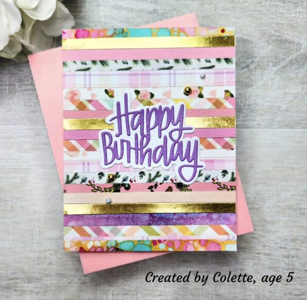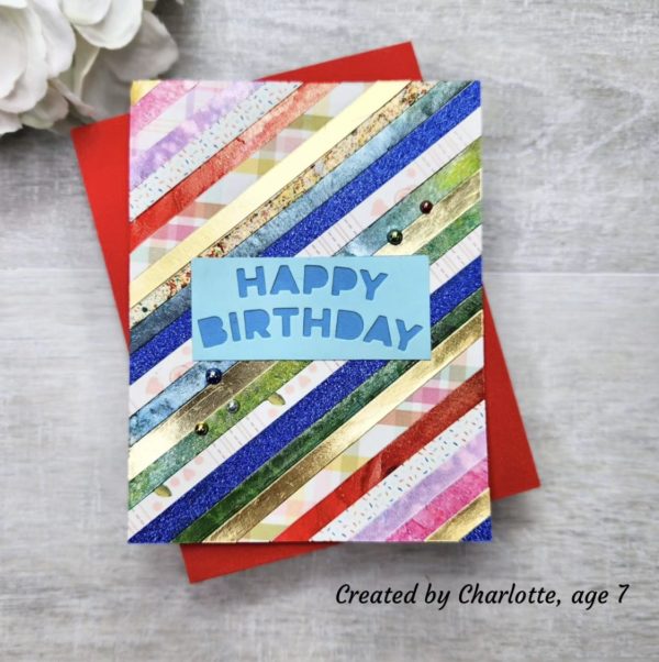 #9 Charlotte age 7– Lols loves that Charlotte created the background using leftover strips of paper! the colors and design are fabulous and the whole card is so beautifully finished! Well done Charlotte! and thank you for joining in with the Kids Vacation Challenge too!