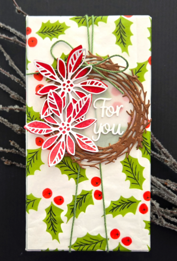 Oh what a surprise to see my gift box as one of the spotlight projects! Thank you so much, Andrea! And you’re right–the wreath is attached to a vellum circle to make the sentiment show up better.