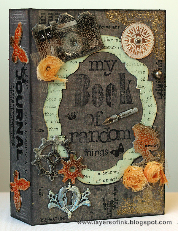 I love this worn book cover by Tim Holtz and decided to decorate it and start filling it with pages about random things, using left over photos, scraps, backgrounds and more. I stamped on fabric, wood, acetate, canvas, frosted film and foil tape. For these types of surfaces, I often use paint, Archival Jet Black Ink or Stazon ink (especially Cotton White and Platinum). The frame on the cover was die cut from Simon Says Stamp’s fabulous Birch Wood Veneer paper.