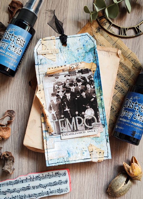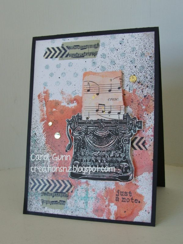 Carol was inspired by Leroy Anderson’s music composition ‘The Typewriter’ and she typed music instead of text using a vintage typewriter stamp from Tim Holtz’s Curiosity Shop For the background she used Distress Inks, Distress Oxide Inks, Distress Oxide Sprays, and added some dots and checks using a Mr Rabbit Stamp Set .