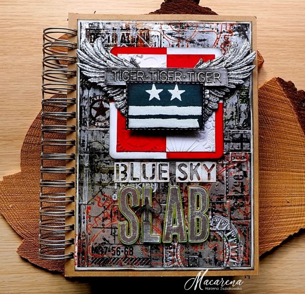 Macarena with her Art Journal page pays tribute to the best Polish combat Pilot killed in the crash of his fighter jet. She was inspired by Top Gun movie music using Tim Holtz Idea-ology Kraft Stock Metallic Classic for the entire background which she embossed with Tim Holtz Sizzix Foundry 3D Embossing Folder. For the callsign she used Tim Holtz Alphanumeric Bulletin dies.