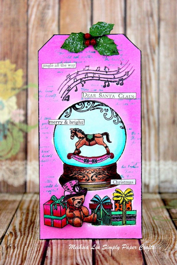Meihsia was inspired to create a holiday tag using Stamperia Gear Up For Christmas Snowglobes Clear Stamps on the background, colored it with Copic SKETCH 72 PC SET C Markers and added sentiments using Tim Holtz idea-ology 2024 Christmas Sticker Book.