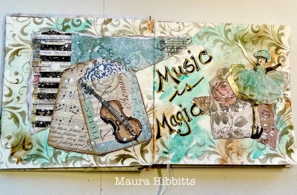 Maura couldn’t decide on just one song, so instead created an art journal spread about the magic of music. She used Stamperia Music papers, Tim Holtz’s Flourish stencil, Simon Says Stamp’s Mocha ink, and Daniel Smith Phthalo Turquoise watercolor.