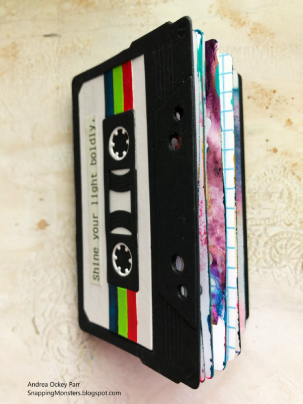 Andrea made a cassette tape notebook using Concord and 9th’s Mix Tape Rewind Die Set and her Sizzix Big Shot. She used her favorite sturdy paper, which Strathmore Mixed Media paper. The quote on the front is from Dina Wakley’s Ledger Paper: Set 2.