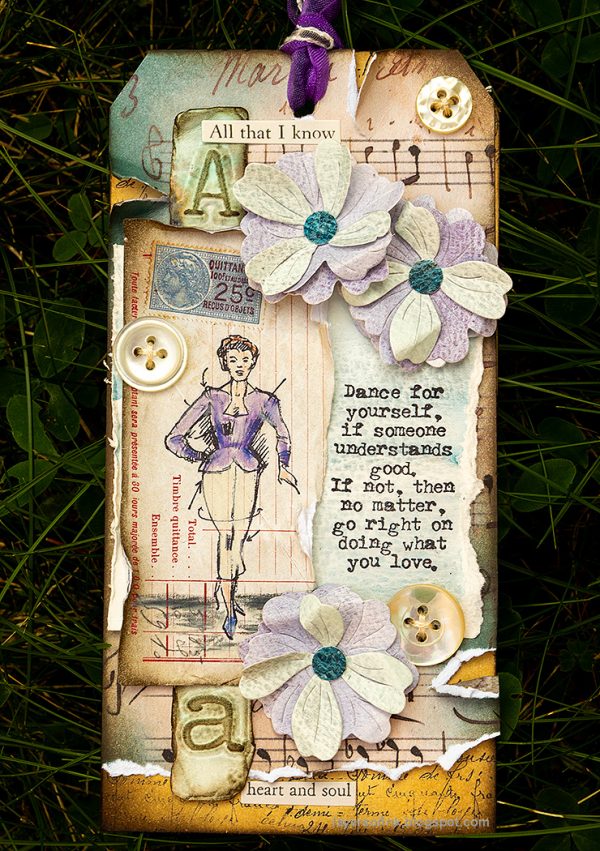 Anna-Karin was made a tag with a dance theme and used a paper with music notes. The stamps come from Tim Holtz Stamper’s Anonymous Purely Random set. The flowers were die cut with Simon Says Stamp Charming Flower Stem, from the new STAMPtember® release.