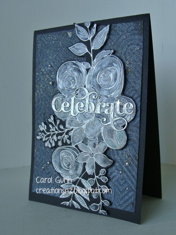 Carol used a Simon Says Stamp Sketch Flower Stamp Set and embossed with Silver Powder. For the background she used a Tucked Heart Background stamp and added a few Silver Pearls and finished with a foiled Celebrate die cut sentiment.