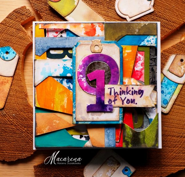 Macarena went quite crazy with building layers on this card using Tim Holtz Sizzix Foundry 3D Embossing Folder with Tim Holtz Idea-ology Kraft Stock Metallic Classic paper for the first panel. Then she started to cover it up with layers of leftovers and she finished with Elizabeth Craft Designs Tag Variety Pack Dies and Tim Holtz Sizzix Countdown dies.