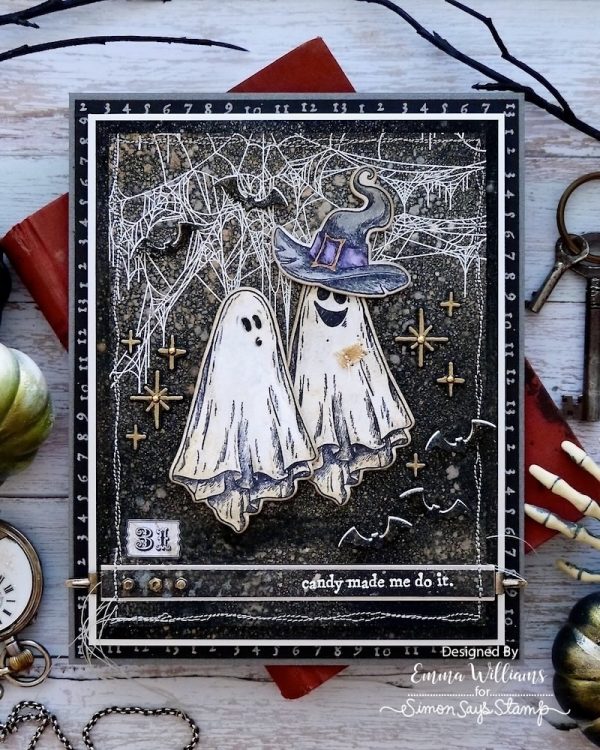 Emma created a Halloween card featuring the ghosts from the Tim Holtz Halloween Doodles Stamps with SSS Dies Bundle. She then used many metallic elements to add shimmer and shine to this make, including Distress Mica Stains for the background, metallic Kraft card, gold embossing powder and idea-ology Hardware Heads.