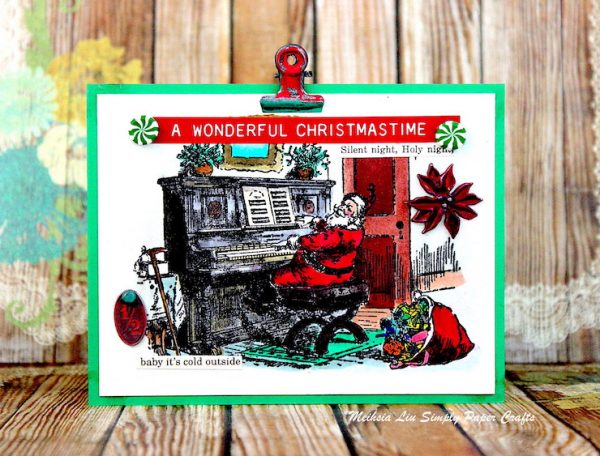 Meihsia was inspired to create a holiday card using Tim Holtz Cling Rubber Stamps CHRISTMAS MAGIC on the background, and decorated it with Tim Holtz idea-ology 2023 Christmas Adornments Deck The Halls and Tim Holtz idea-ology 2024 Christmas Sticker Book.