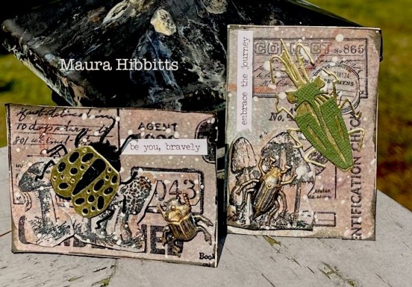 Maura made a duo of insect themed ATCs. She used Tim Holtz’s Funky Insects dies, added metal with Tim Holtz’x Entymolorgy Adornments, added some Tim Holtz Tiny Toadstools, and went a bit wild with the Simon Says Stamp White Splatter.