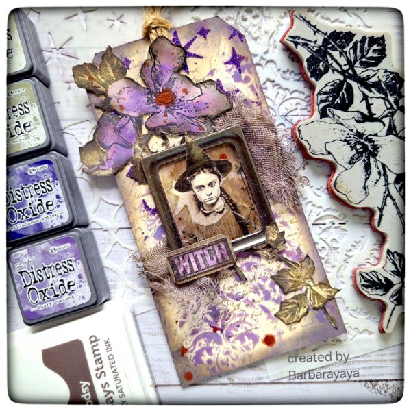 Barbara created a tag using Tim Holtz Idea-ology 2024 Halloween Sticker Book and Idea-ology Photo Frames. She chose Stampers Anonymous Gothic stencil and Ranger Distress Ink Pad Mini Oxide for the background. The flower is from Tim Holtz Stampers Anonymous Dearly Departed stamp set.