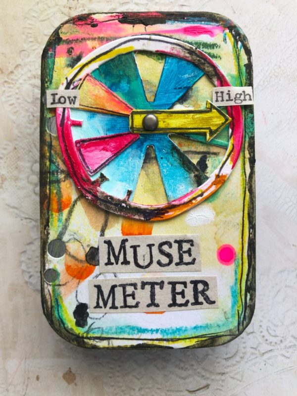 Andrea converted a small metal tin into a “Muse Meter” using the Rainbow Wheels die set by Sizzix and her sturdy Big Shot. The arrow can spin thanks to a classic metal fastener. She stamped the sentiment with AALL & Create’s Bits of Alpha stamp set.