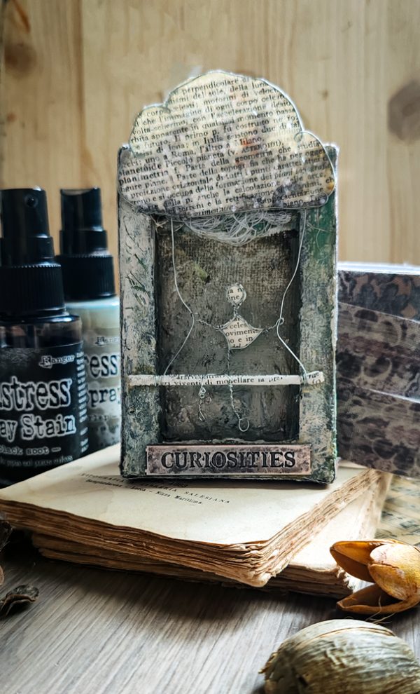 Zoey used Elizabeth Craft Designs Shadow Box Frames to create her little box, then she covered the surface with Dina Wakley MEdia Sitcky back canvas tape and the sides with Tim Holtz Linen Tape. She used Crackle Paste to create texture and used Distress Spray Stain and Oxide Spray to add color. She also Embellished the metal cloud with Rock Candy Chunky Glitter.