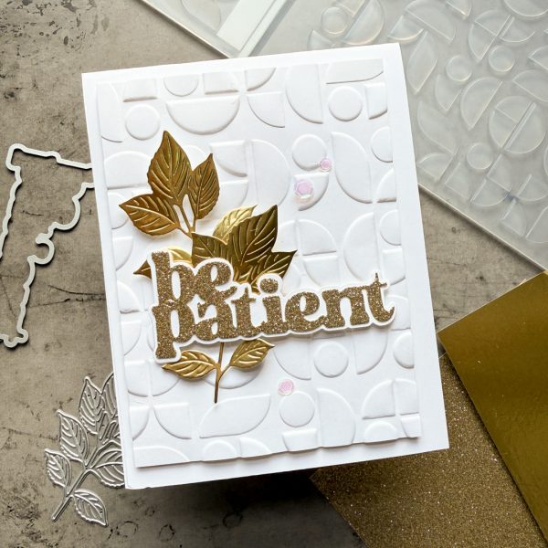Cheiron created a card with die cuts cut from Matte Gold Metallic cardstock. She used the Simon Says Stamp Mid-Century Ethereal embossing folder to create the background for her card, then added some leaves cut from the Autumn Leaf Branch dies. She added a simple sentiment cut from gold glitter cardstock using the Be Patient dies.