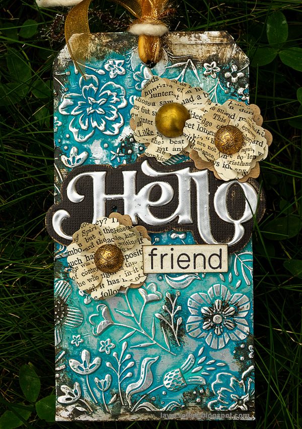 Anna-Karin made a tag with different metallic elements. The background was covered with metallic tape and dry embossed in Simon Says Stamp Boho Flowers embossing folder. The flowers were die cut with Simon Says Stamp Charming Flower Stem and the title with Simon Says Stamp Fancy Hello.