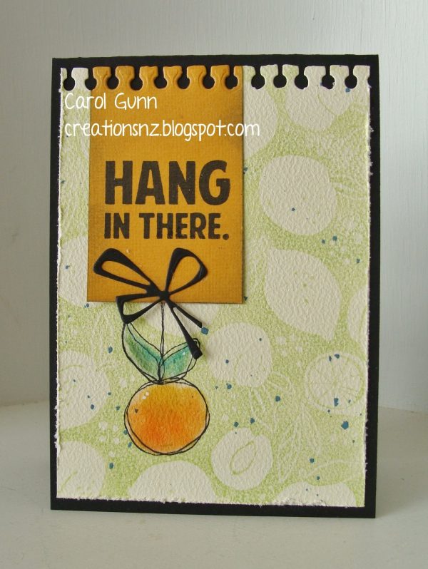 Carol used a Simon Says Stamp XL Stacked Greetings Stamp Set for the focus and used a Fresh Fruit Cling Stamp for the background. She doodled one piece of fruit and tied it to the sentiment with a Tim Holtz Funky Festive Bow. She used a Tim Holtz Vault Edges Die Set to add a funky border across the top.