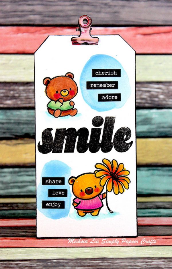 Meihsia was inspired to create a tag using Simon Says Clear Stamps Rain or Shine on the background, and added sentiments with CZ Design Clear Stamps Smile cz397c Friend Like You and Tim Holtz idea-ology 1088 Chitchat Stickers.