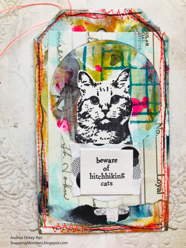 Andrea loved this humorous sentiment from AALL & Create’s Free Broom Rides stamp set. She also used Dina Wakley’s Circle Furbabies stamp set for the ferocious feline. She used Dylusions Colour Caykes and Sticks to add scribbly pops of color.