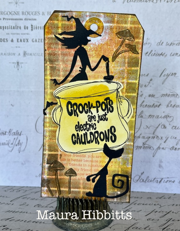 Maura had to use this “perfect for the season” stamp as here focus – Riley and Co’s Electric Cauldron stamp., and since it’s STAMPtember, she used more stamps such as the Simon Says Stamp Friendship Text Background stamp, and Tracy Evans On the Wild Side.