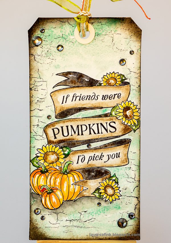 Anna-Karin made an autumn tag with the sentiment in focus. The sentiment and ribbon banner were stamped with the new Simon Says Stamp Pumpkin Blessings set from the STAMPtember®release.