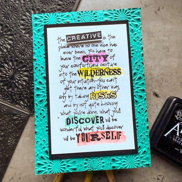 Cheiron used the sentiment from the Tim Holtz Stampers Anonymous Urban Tapestry set as the focus of her card. She highlighted the bold words in the sentiment using Tim Holtz Distress Watercolor Pencils. She added the sentiment onto a black panel and added it to a card panel embossed with the Large Kaleidoscope Folder.