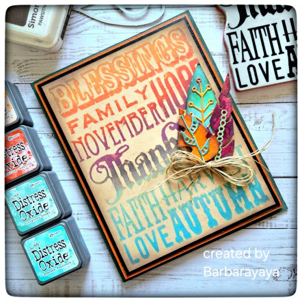 Barbara loves autumn! She was inspired by a stamp from Tim Hotz Stampers Anonymous’ “Thankful Silhouettes” set, which is perfect for this challenge. She created an autumn color palette for her card using the new Ranger Ink Distress Mini Oxide. The leaves were cut out using Sizzix Artsy Leaves Thinlits dies.
