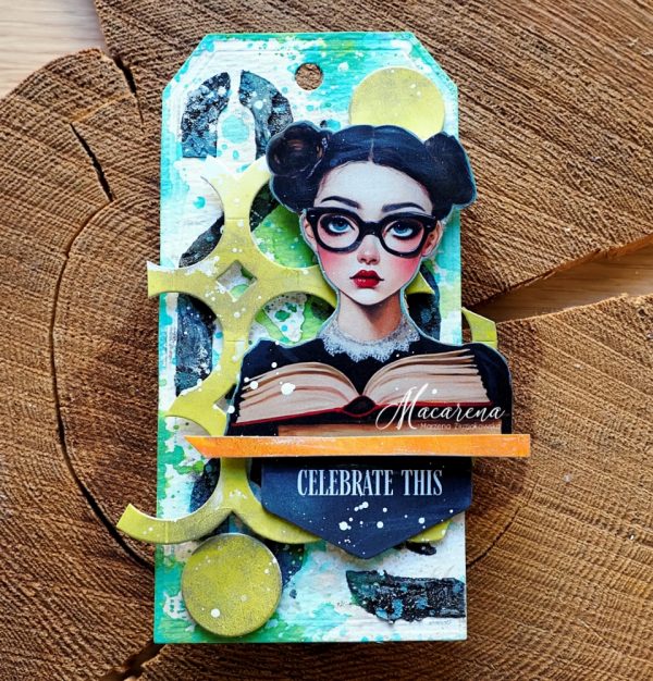 Macarena used Tim Holtz Ranger Distress Texture Paste Black Opaque and heated it until it bubbled which added even more texture. She layered the tag with Simon Says Stamp Circle Quilt die and finished it with one of the lovely Brutus Monroe Bookworm Creative Cards.