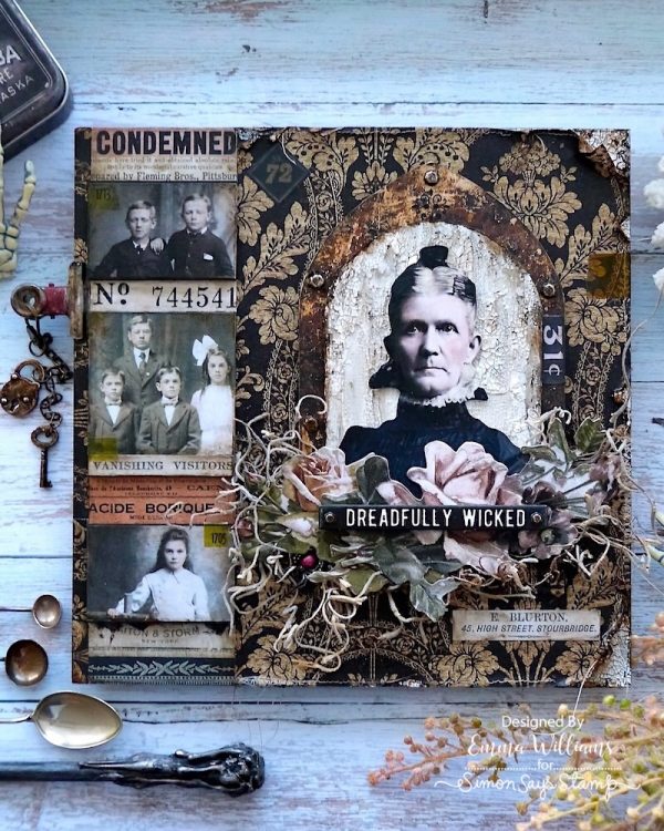 Emma created a project for Halloween and told the story of someone dreadfully wicked. She used a Square Etcetera Panel, covered with Collage Strips and Halloween Backdrops, before adding a Paper Doll Portrait, some Halloween ephemera and plenty of Distress Crackle Paste to create the texture.