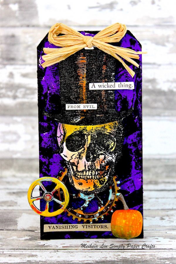 Meihsia was inspired to create a mixed media Halloween tag using The Crafter’s Workshop LIGHT AND FLUFFY MODELING PASTE to create the texture on the background, and decorated it with Tim Holtz Cling Rubber Stamps UNDERTAKER and Tim Holtz idea-ology 2024 Halloween Sticker Book.